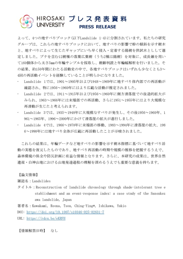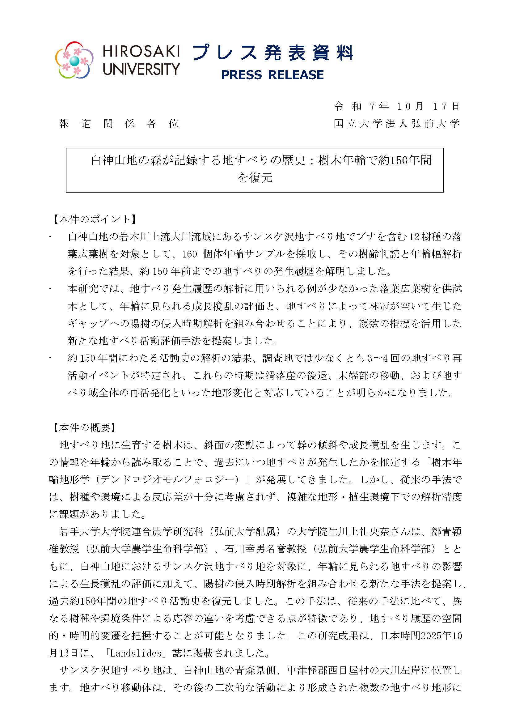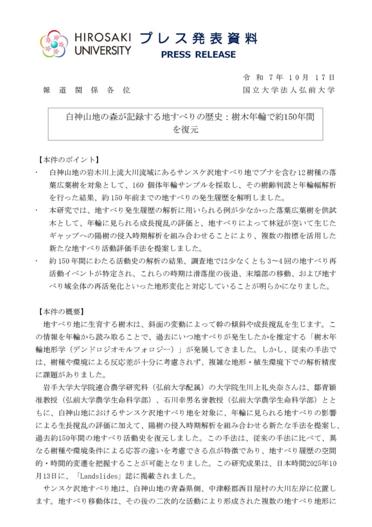 【プレスリリース】白神山地の森が記録する地すべりの歴史:樹木年輪で約150年間を復元(岩手大学大学院連合 農学研究科(弘前大学配属)3年 川上 礼央奈さん)
