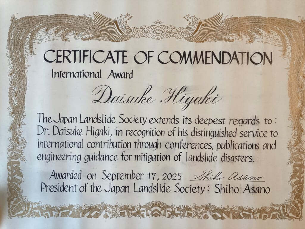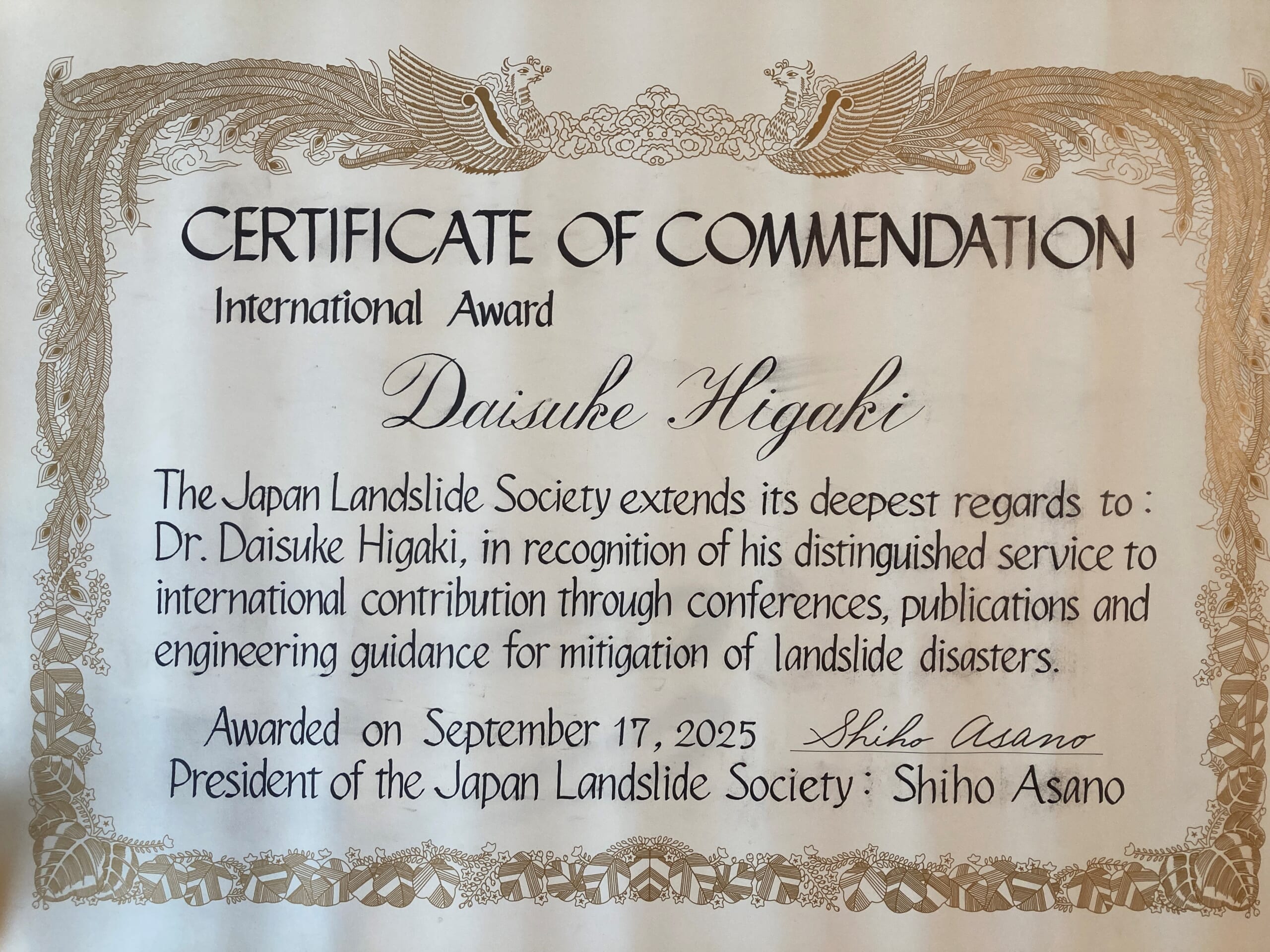 本学部 檜垣 大助 名誉教授が,2025年度 日本地すべり学会賞 国際賞を受賞しました。