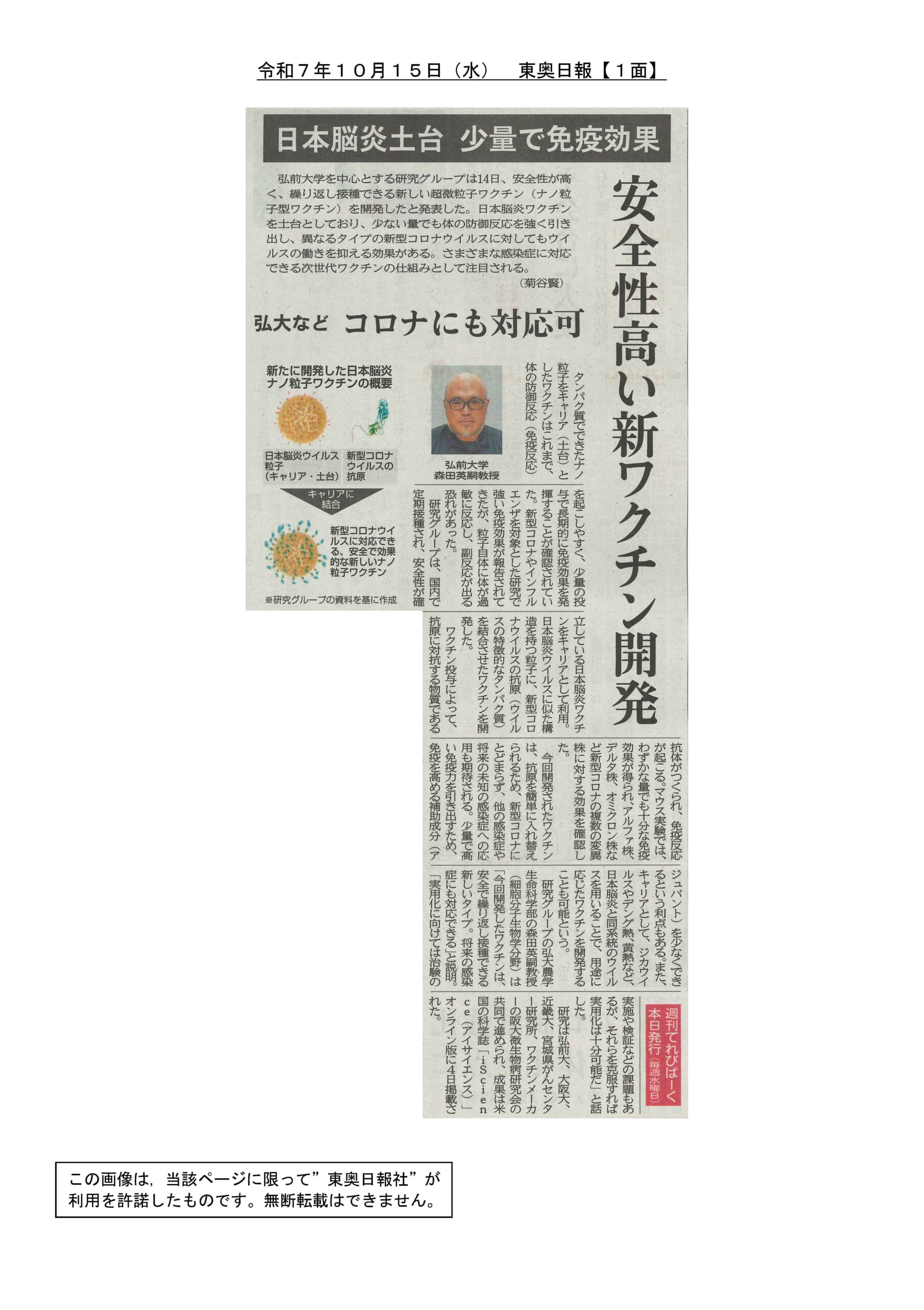 東奥日報 令和7年10月15日(水)掲載記事『安全性高い新ワクチン開発 日本脳炎土台 少量で免疫効果』森田 英嗣 教授(分子生命科学科)