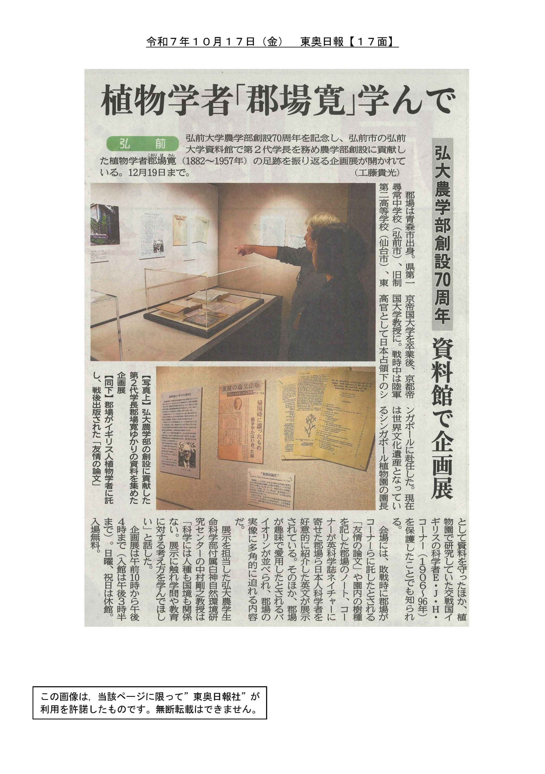 東奥日報 令和7年10月17日(金)掲載記事『植物学者「郡場寛」学んで 弘大農学部創設70周年 資料館で企画展』