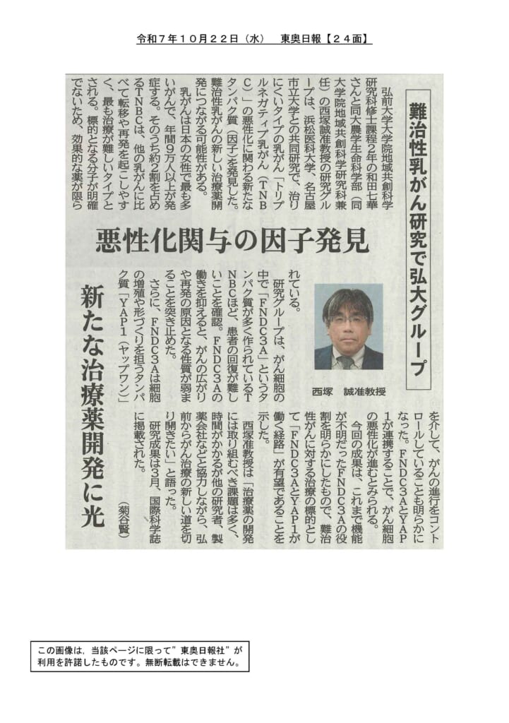 東奥日報 令和7年10月22日(水)掲載記事『難治性乳がん研究で弘大グループ 悪性化関与の因子発見』西塚 誠 准教授(食料資源学科)