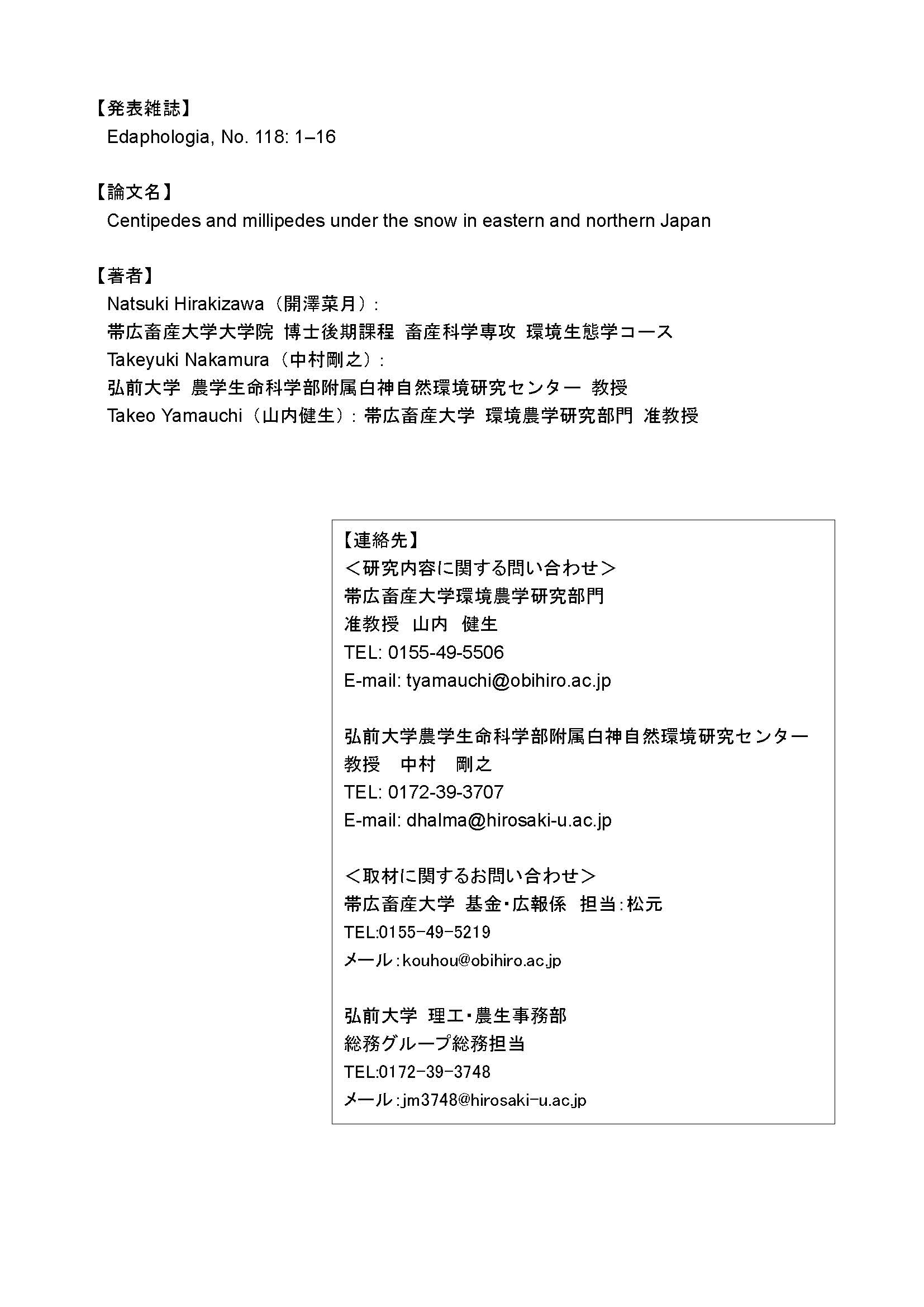 【プレスリリース】冬期に積雪下で活動するムカデ類・ヤスデ類の実態を解明(白神自然環境研究センター 中村 剛之 教授)